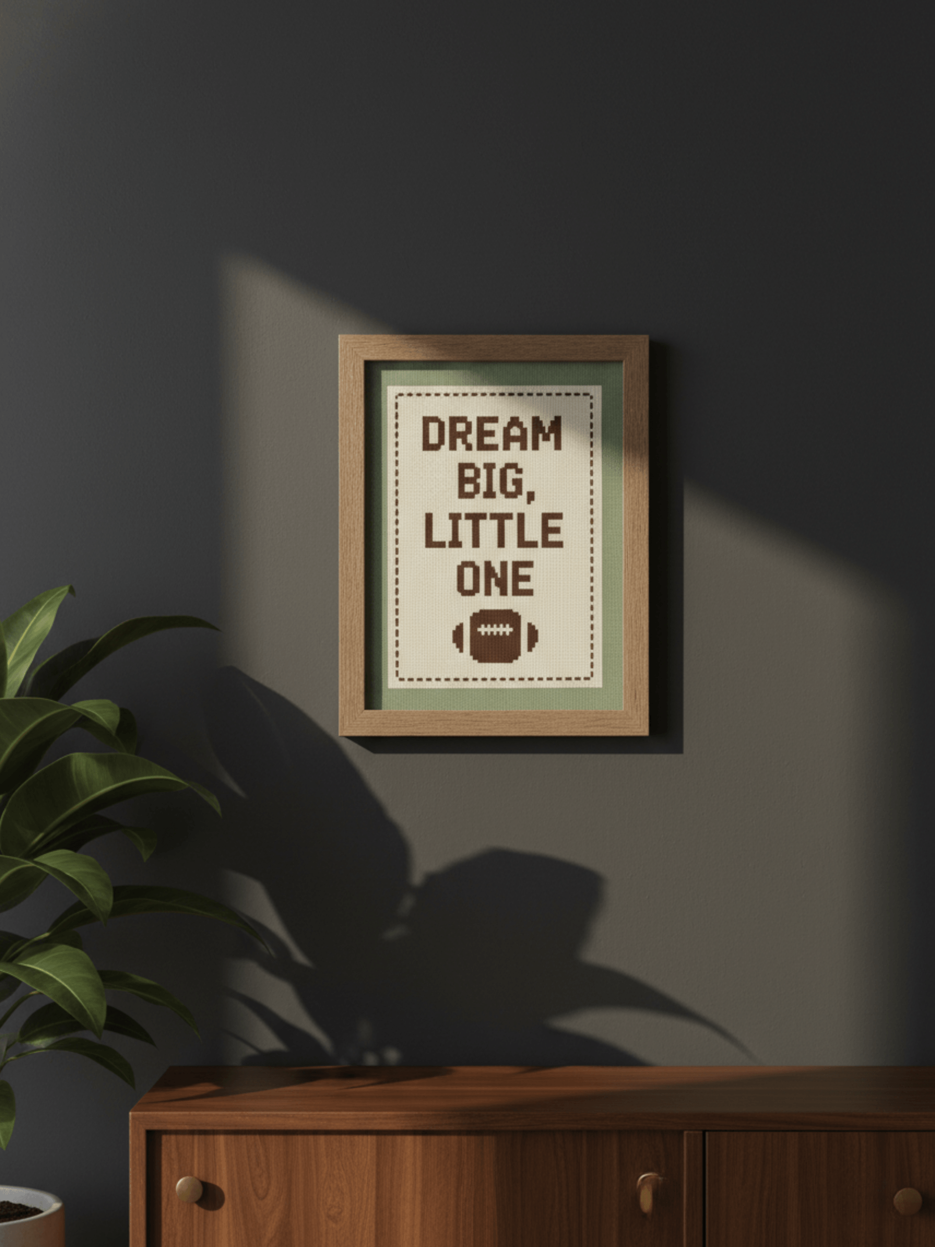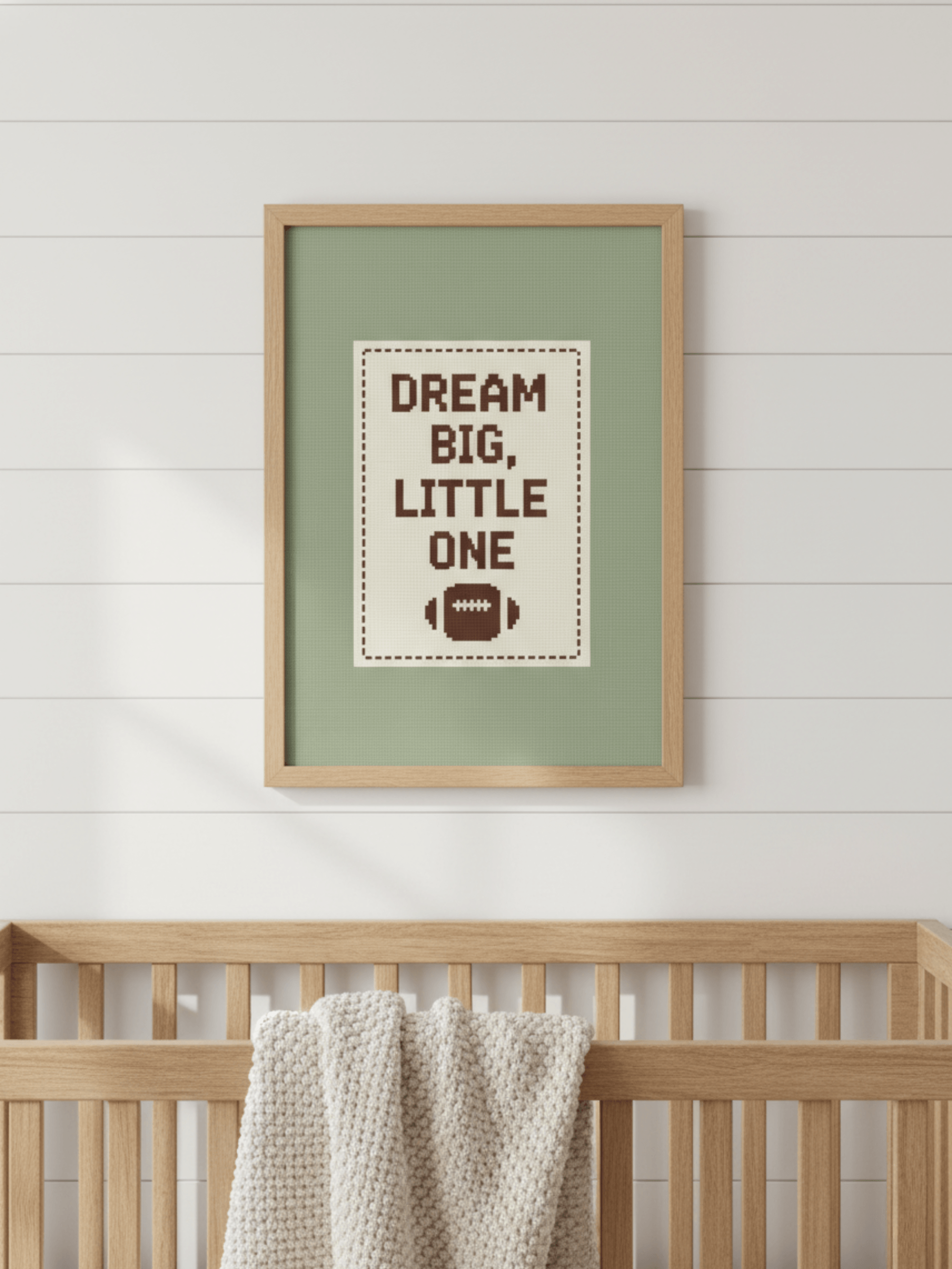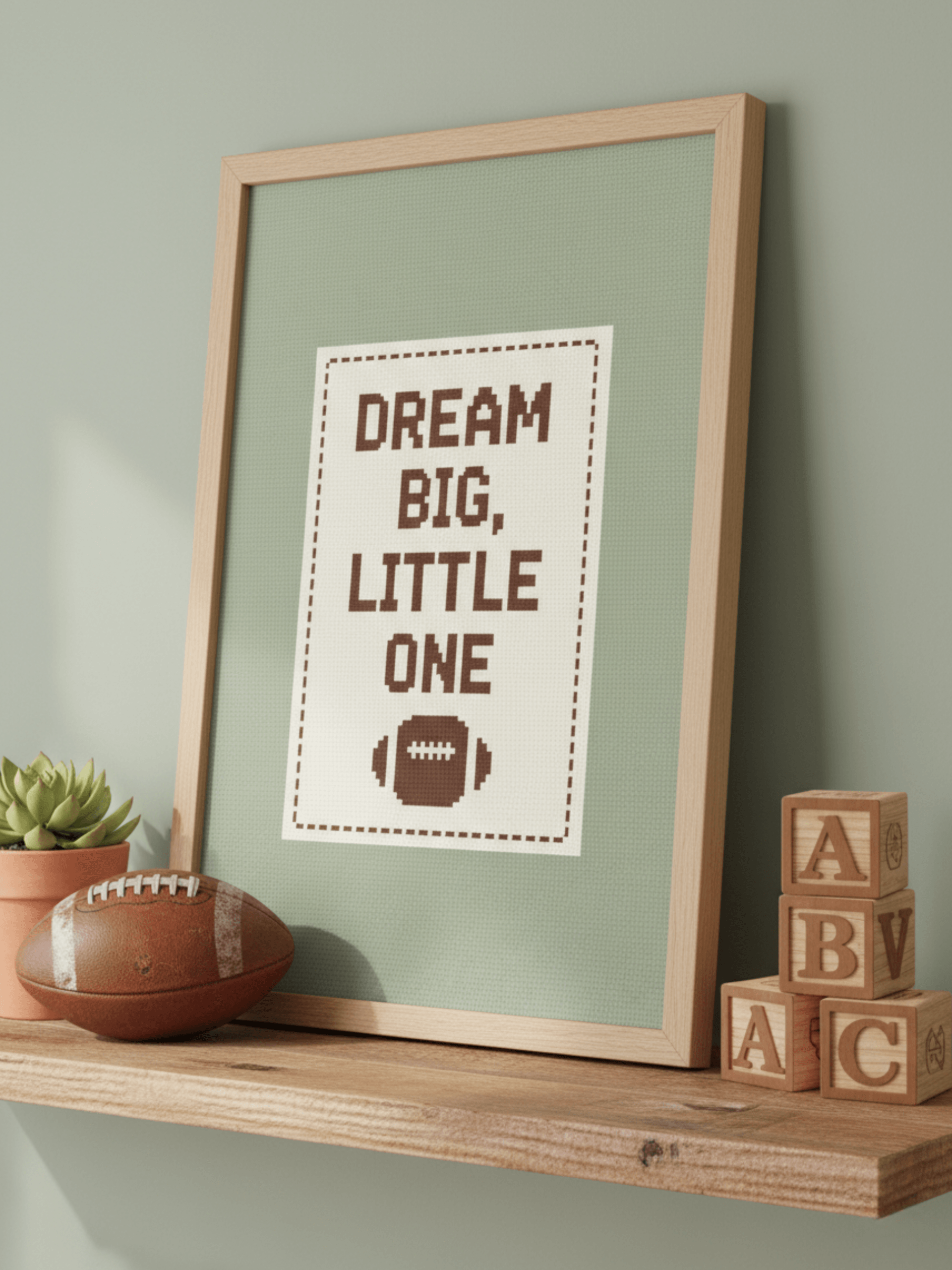 Transform your space with this charming “Dream Big, Little One” stitched-style wall art, designed to add warmth and encouragement to any nursery, kids’ room, or playroom. Featuring a cozy cross-stitch texture, soft sage green background, and a classic football motif, this artwork blends vintage charm with heartfelt inspiration.
