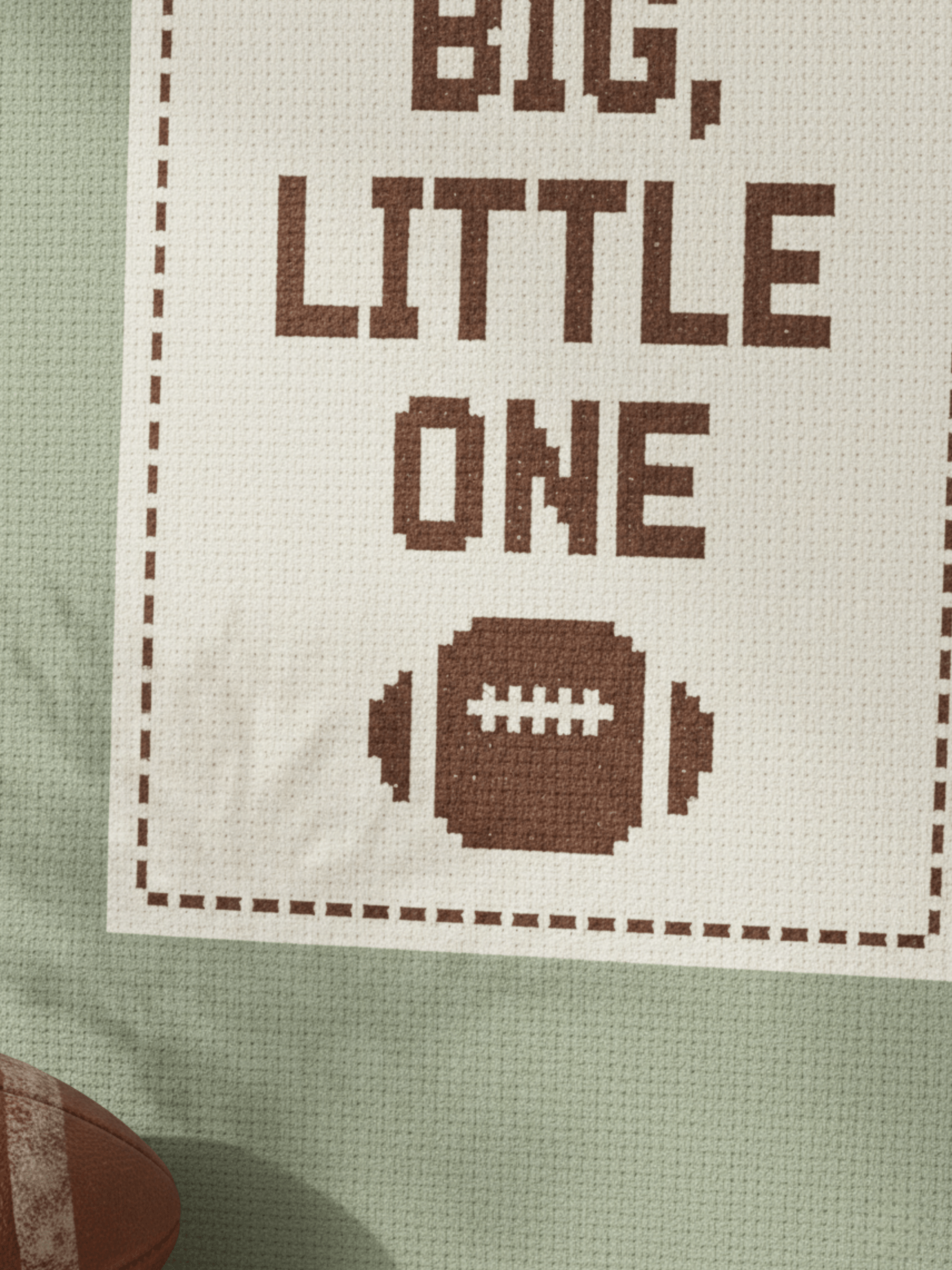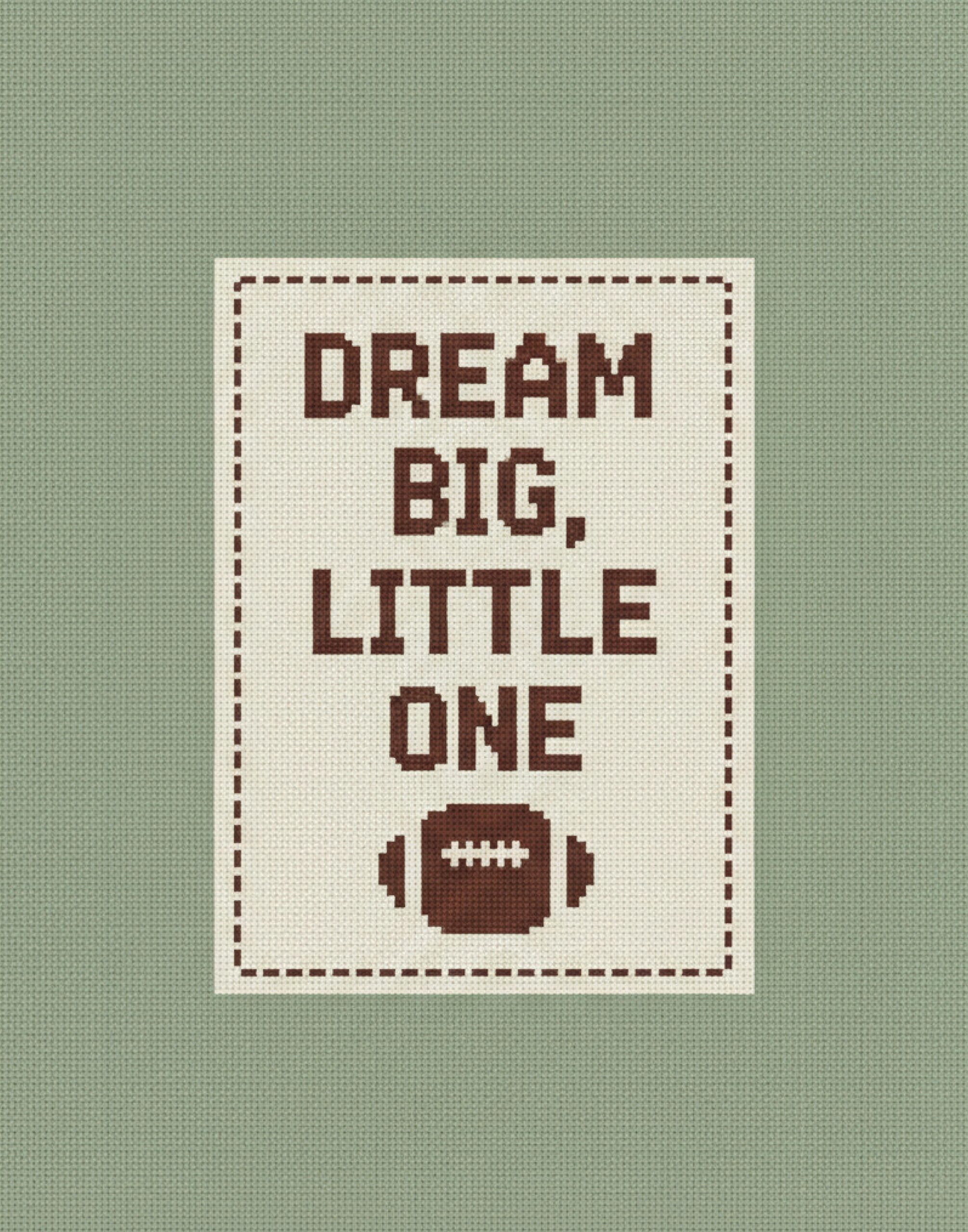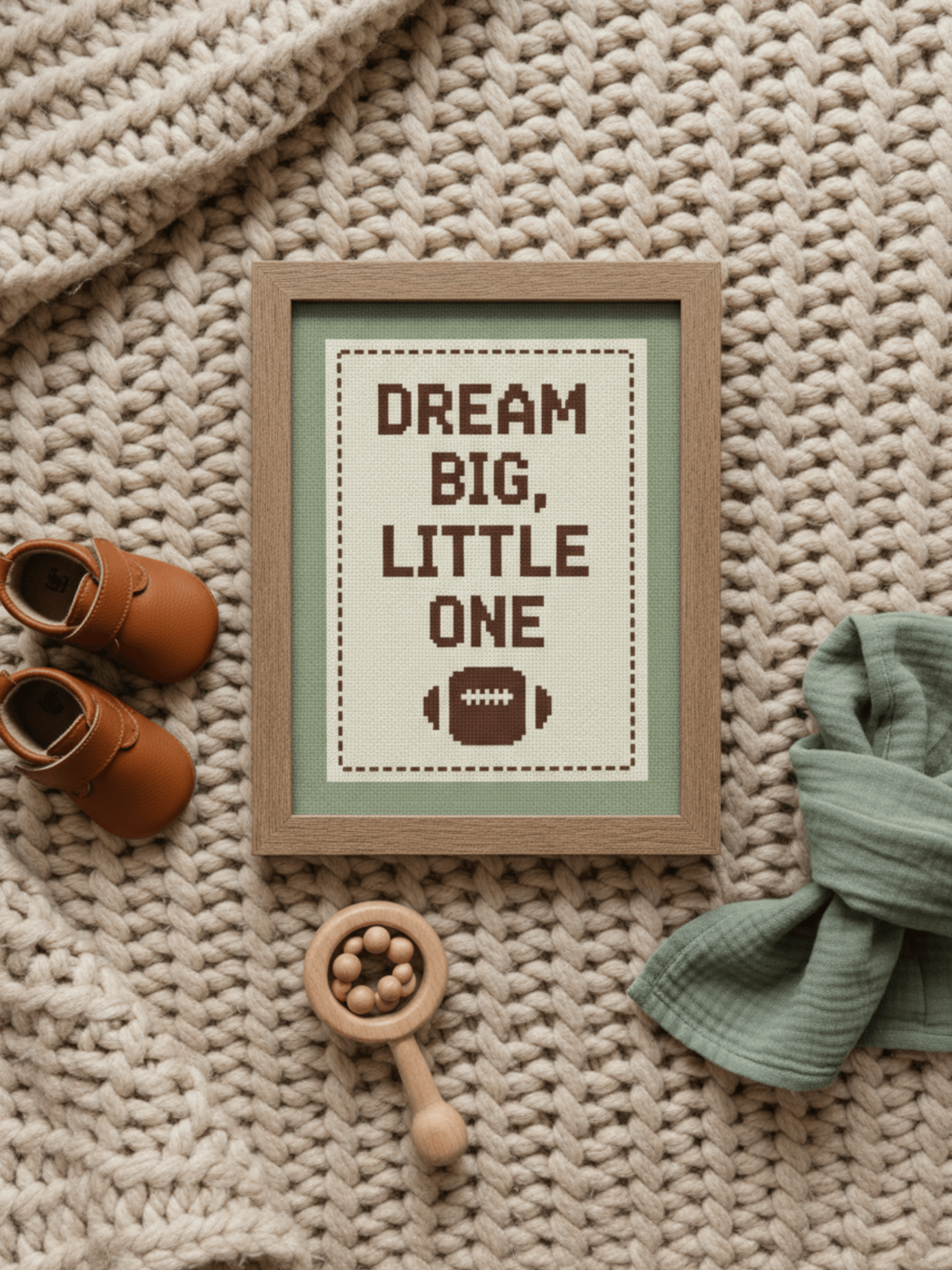 Transform your space with this charming “Dream Big, Little One” stitched-style wall art, designed to add warmth and encouragement to any nursery, kids’ room, or playroom. Featuring a cozy cross-stitch texture, soft sage green background, and a classic football motif, this artwork blends vintage charm with heartfelt inspiration.